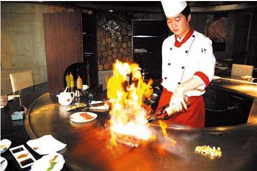 日式鐵板燒現(xiàn)場(chǎng)制作,食客還可在品嘗美味佳肴的同時(shí)欣賞廚師精湛廚藝。短鏟兩把、刀叉各一把,左手邊是銅帽蓋,右手有鹽、胡椒各種調(diào)料罐,這就是鐵板燒廚師所有的道具了。看廚師一邊翻滾著高溫區(qū)的牛排,同時(shí)還騷擾著保溫區(qū)的魷魚(yú),忙里偷閑時(shí)再將刀叉、胡椒罐耍得眼花繚亂,讓人食欲大增。